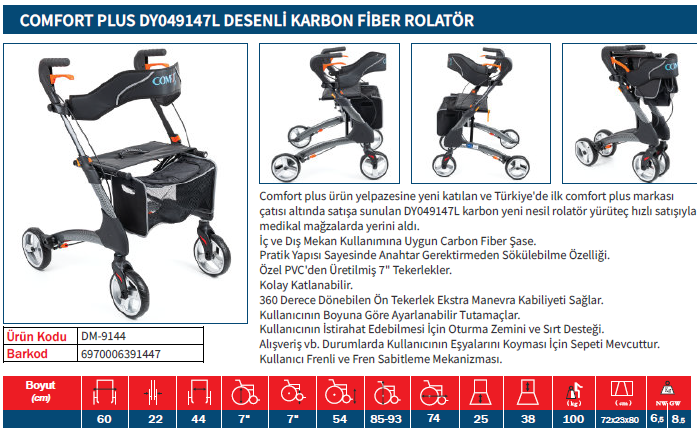Comfort plus ürün yelpazesine yeni katılan ve Türkiye'de ilk comfort plus markası çatısı altında satışa sunulan DY049147L karbon yeni nesil rolatör yürüteç hızlı satışıyla medikal mağzalarda yerini aldı.