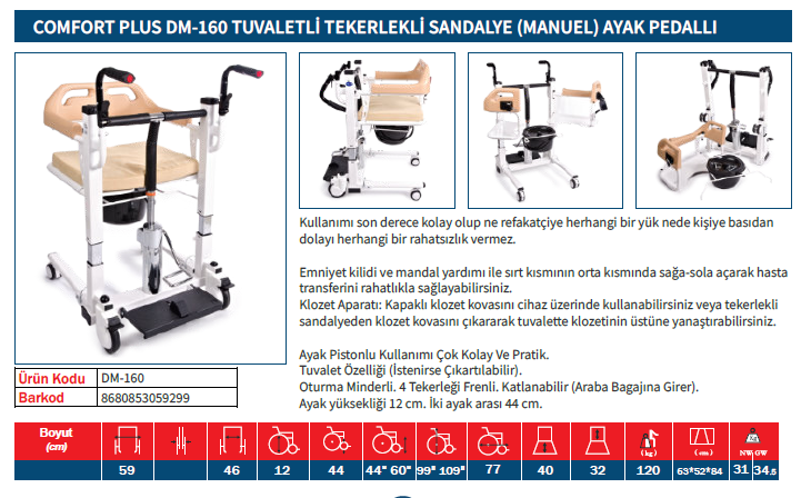 Comfort Plus DM-160 Tuvaletli Tekerlekli Sandalye (MANUEL) Ayak Pedallı