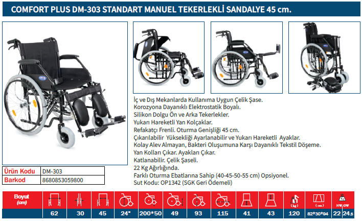 Comfort Plus DM-303 Standart Manuel Tekerlekli Sandalye (Özellikli,Baldır Destekli)