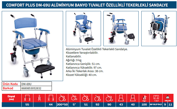 - Alüminyum Tuvalet Özellikli Tekerlekli Sandalye