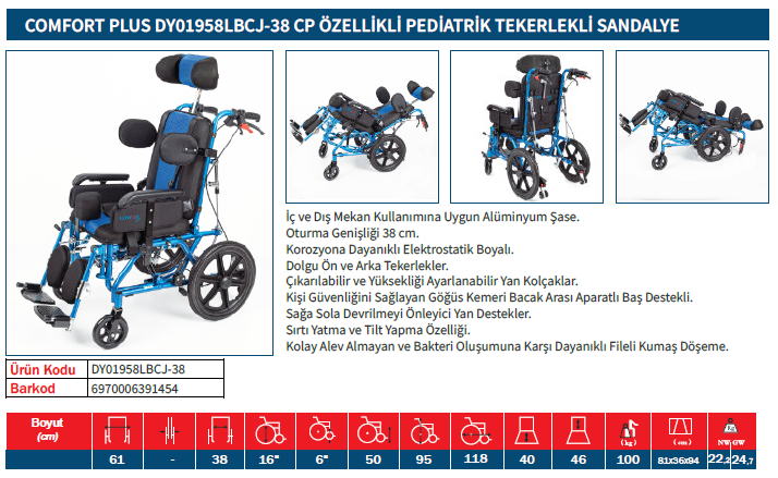 Comfort Plus DY01958LBCJ-38 CP model çocuk tekerlekli sandalyesi 1 ila 15 yaş arası engelli çocukların kullanımına uygun manuel çocuk tekerlekli sandalye modelidir. Comfort Plus DY01958LBCJ-38 CP çocuk tekerlekli sandalyesinin bir diğer özelliği ise serebral palsi yada üst gövde beden bölümüne tamamen hakim olamayan yada istemsiz hareket eden engelli çocukları sandalye üzerinde dik pozisyonda tutmak amaçlı yan bölümlerde yanal destekleri vardır.