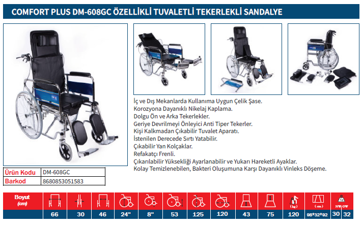 Comfort Plus DY02608GC Sırtı Yatar Ayak Kalkar Tuvalet Özellikli Tekerlekli Sandalye