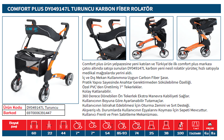 Comfort plus ürün yelpazesine yeni katılan ve Türkiye'de ilk comfort plus markası çatısı altında satışa sunulan DY049147L karbon yeni nesil rolatör yürüteç hızlı satışıyla medikal mağzalarda yerini aldı.