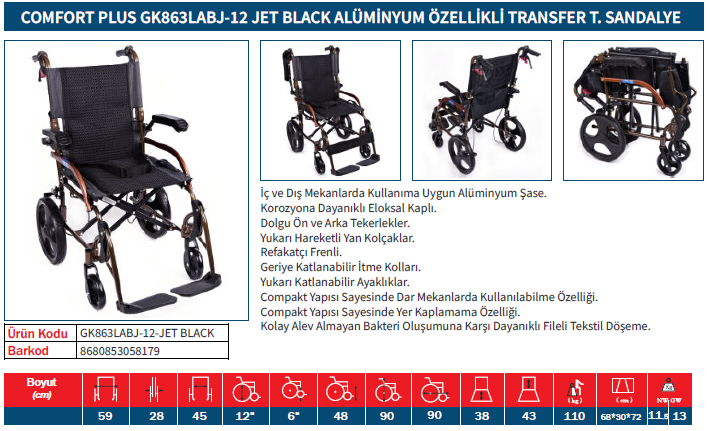 Comfort Plus GK863LABJ-12 Jet Black Transfer Alüminyum Tekerlekli Sandalye