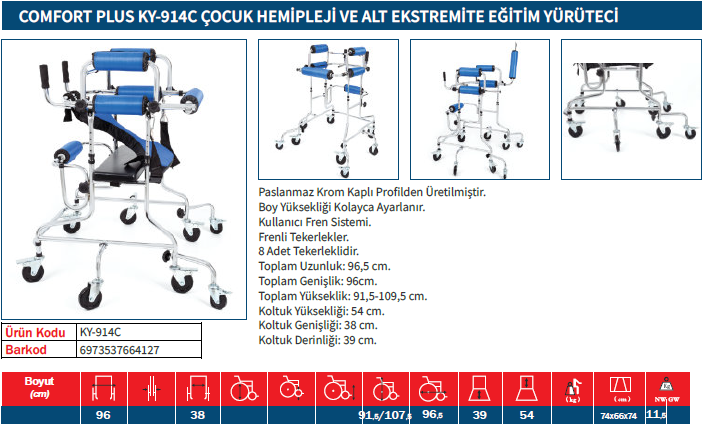 Çocuk yürüteç modelimiz Comfort Plus DM-914B hastalığı veya doğuştan gelen engeli nedeniyle yürümekte zorlanan çocuk hastalar için dizayn edilmiş yürüteç modelimizdir. Kişinin boyuna göre yüksekliği ayarlanabilen yürüteç modelimizde kullanıcı güvenliği ön planda tutulmuştur.