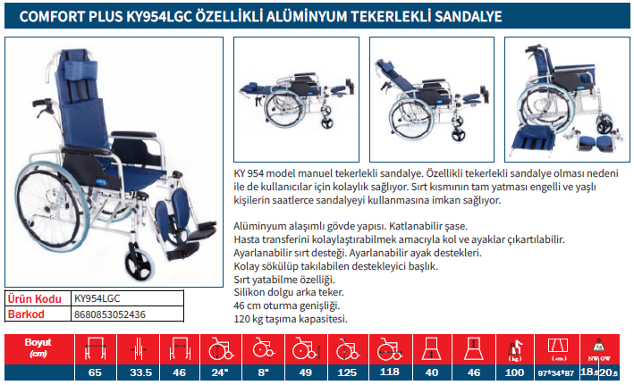 KY 954 model manuel tekerlekli sandalye. Özellikli tekerlekli sandalye olması nedeni ile de kullanıcılar için kolaylık sağlıyor. Sırt kısmının tam yatması engelli ve yaşlı kişilerin saatlerce sandalye üzerinde oturmasına imkan sağlıyor.