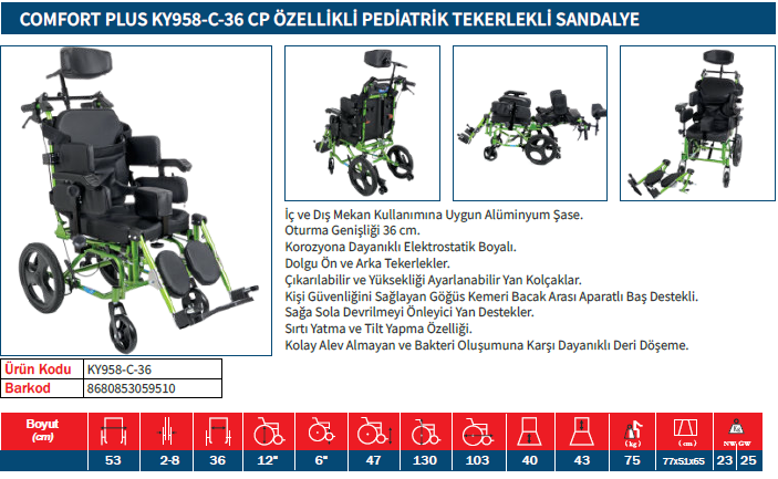 Comfort Plus KY958-C-36 CP model çocuk tekerlekli sandalyesi 1 ila 15 yaş arası engelli çocukların kullanımına uygun manuel çocuk tekerlekli sandalye modelidir. Comfort Plus KY958-C-36 CP çocuk tekerlekli sandalyesinin bir diğer özelliği ise serebral palsi yada üst gövde beden bölümüne tamamen hakim olamayan yada istemsiz hareket eden engelli çocukları sandalye üzerinde dik pozisyonda tutmak amaçlı yan bölümlerde yanal destekleri vardır.
