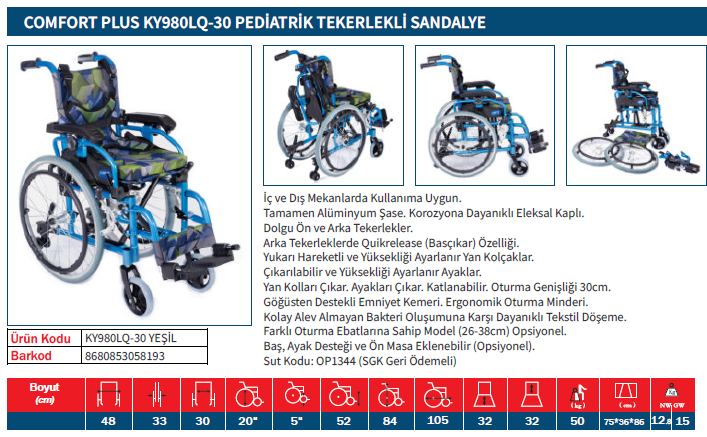 Comfort Plus KY980LQ-30 Alüminyum Pediatrik Özellikli Tekerlekli Sandalye
